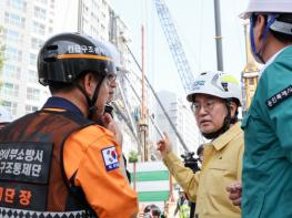 김동연 경기도지사가 지난 5일 밤 천공기(지반을 뚫는 건설기계) 전도사고가 발생한 용인시 기흥구 서천동 인덕원~동탄 복선전철 공사 현장을 찾아 사고 수습 상황을 점검했다.6일 오전 11시 반경 현장을 찾