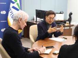 김동연 경기도지사는 14일 오후 서울 여의도 중앙협력본부 사무실에서 프랑스 르몽드지와 긴급인터뷰를 했다.르몽드지의 필립 메르메스 동북아 특파원은 윤석열 대통령의 계엄령 선포 직후 정부의 도청 폐쇄