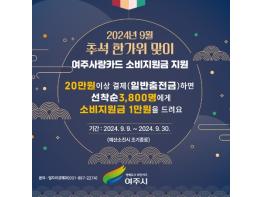 여주시는 추석 한가위를 맞이하여 지역화폐 ‘여주사랑카드’ 소비지원금을 오는 9월 9일부터 지원한다고 밝혔다. 9월은 추석 명절이 있어 소비 지출이 많은 달로 여주사랑카드 소비지원금 지원 시 많은 시