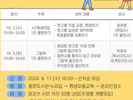 인천광역시교육청중앙도서관은 읽걷쓰 사업의 일환으로 10월에 운영하는 시민 저자 보수 특강 ‘누구나 쉽게 1인 출판’ 참여자를 9월 11일부터 모집한다.이번 특강은 중앙도서관에서 글을 쓰고 책을 펴낸