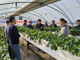 충남도 농업기술원은 11일 논산시 현장접목연구 실증농가에서 딸기 농가의 소득증대를 위한 ‘딸기 조기정식 후 관부냉방 기술 현장평가회’를 개최했다. 현장평가회에서는 딸기 재배농가, 연구 및 지도기