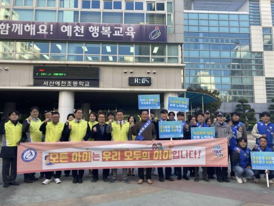 이번 지역합동 아동학대 및 학교폭력 예방 캠페인은 서산교육지원청 주관으로 11월 7일 서산예천초등학교 통학로 일대에서 전개했으며 서산경찰서, 법무부 청소년범죄예방위원회 서산지구, 서산예천초등학교 교직원들이 동참했다.