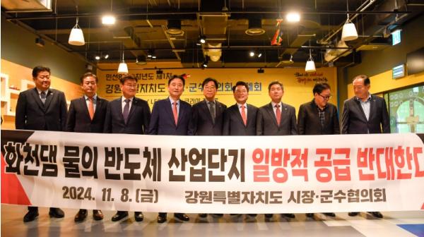 강원특별자치도 시장·군수협의회는 8일 춘천 레고랜드에서 열린 정례회에서 화천댐 물의 반도체 산업단지 공급 결정에 반대하는 결의문을 채택했다.