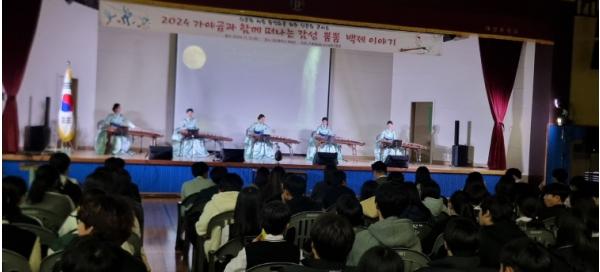 서산교육지원청에서는 학생들의 인문 소양 역량 제고를 통한 문해력 향상을 위해 2024 찾아가는 인문학 콘서트를 대산중학교 학생과 교직원200여명이 함께한 가운데 11월 12일(화) 대산중학교 체육관에서 ‘가야금과 함께 떠나는 감성뿜뿜 백제이야기’ 라는 주제로 실시했다.