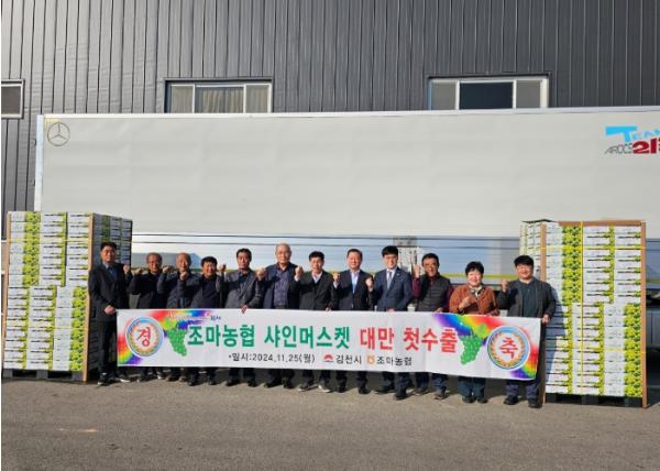 김천시는 지난 25일 조마농협 농산물유통센터에서 샤인머스켓의 대만 수출을 기념하는 선적식을 개최했다. 이날 행사에는 김해조 조마농협장, 강준규 수석이사를 비롯한 감사, 김석조 시의원, 김영택 농업정책과장 등 약 15명이 참석했다.