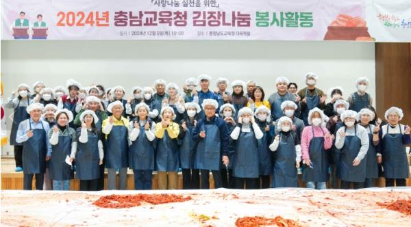 충남교육청의 김장 나눔 봉사는 2015년 처음 시작한 이후 10년 동안 꾸준히 이어져 왔으며, 총 3,900포기의 김치를 177곳의 복지시설에 전달해 지역사회의 큰 호응을 얻고 있다.