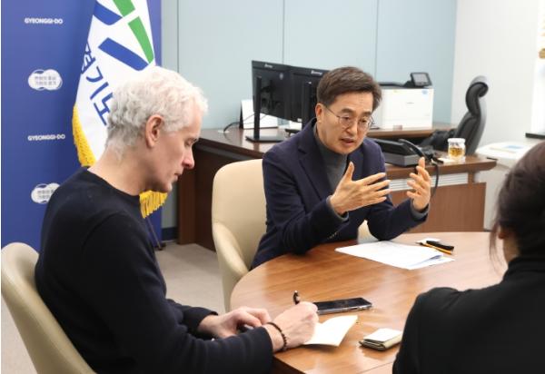 김동연 경기도지사는 14일 오후 서울 여의도 중앙협력본부 사무실에서 프랑스 르몽드지와 긴급인터뷰를 했다.
