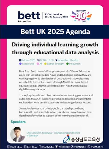 충남교육청은 매년 영국에서 열리는 세계 최대 규모의 에듀테크 박람회인'2025 BETT(British Educational Training and Technology) UK'에 공식 초청을 받아, 국내 최초로 개발한 ‘마주온 교육데이터 분석 시스템’의 우수 사례를 1월 24일 12시에 영국 현지에서 발표한다.