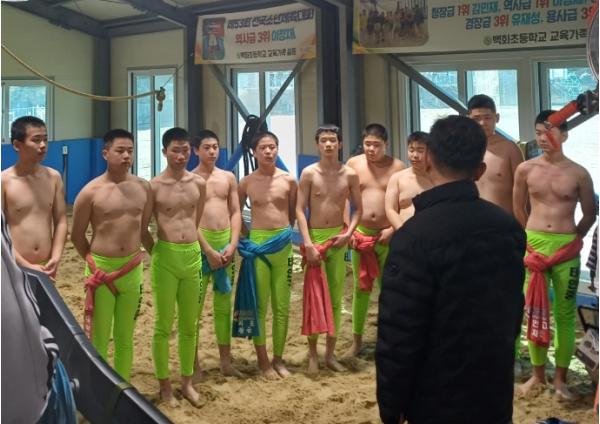 태안교육지원청은 17일 충청남도교육청 체육교육팀 직원들과 함께 백화초등학교 씨름장에 방문해 “제54회 전국소년체육대회”를 대비해 합동 동계 훈련에 매진하고 있는 백화초, 태안중 씨름부 선수들을 격려했다.