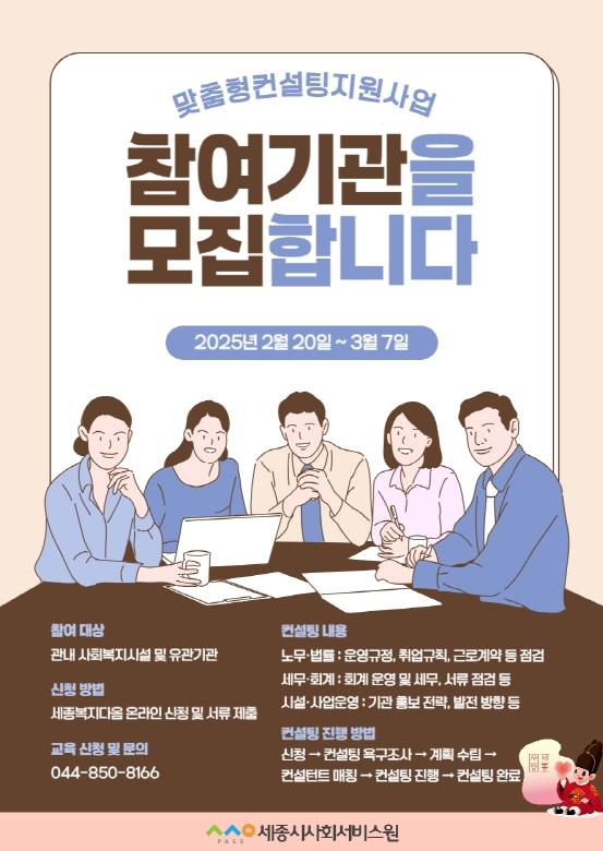 세종시사회서비스원(김명희 원장)은 내달 7일까지 관내 사회복지시설을 대상으로 맞춤형컨설팅지원사업 참여기관을 모집한다고 밝혔다.