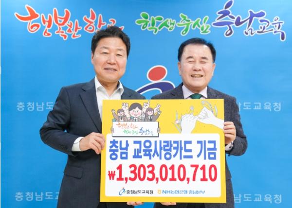 충남교육청은 28일 엔에이치(NH)농협은행 충남본부로부터 지난해 교직원과 학교의 충남교육사랑카드 사용으로 조성된 기금 13억 3백만 원을 전달받았다.