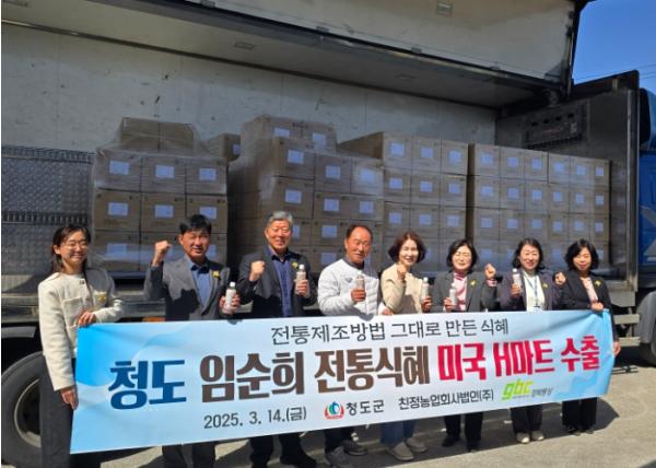 청도군은 지난 14일 친정농업회사법인(주)에서 임순희 전통 식혜를 미국 대형 한인 마트 체인인 H-마트에 수출하기 위해 선적식을 가졌다.