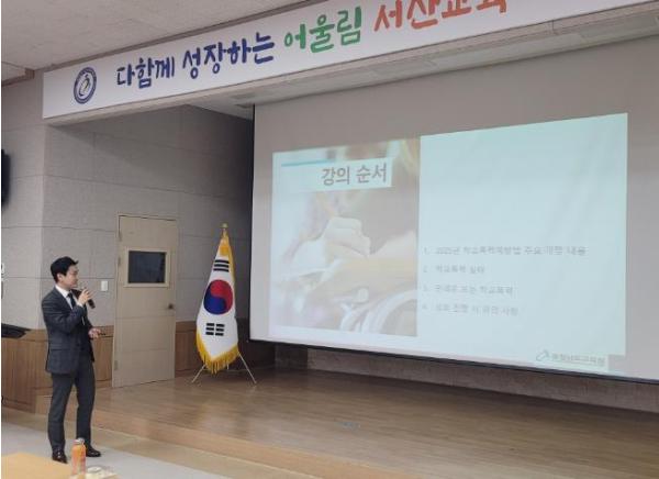 서산교육지원청은 이날 2025학년도 신규 위원의 위촉식과 2024학년도 학폭위 운영 현황 등을 공유하고, 충청남도교육청에서 학교폭력 관련 법률 상담 및 지원을 하고 있는 변호사가 최근 개정된 법률과 판례를 중심으로 심의위원회 질의응답, 참고인 진술, 조치결정 등 심의·의결 과정에서 유의할 사항들을 전달하며 실질적인 역량 강화에 중점을 두고 연수를 진행했다.