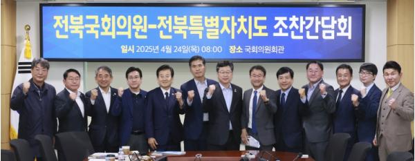 전북특별자치도는 24일 국회의원회관에서 전북 국회의원들과 조찬간담회를 열고 지역 발전을 위한 전략과 공동 대응 방안을 공유했다. 이날 간담회에는 김종훈 경제부지사와 이원택 더불어민주당 전북특별자치도당위원장을 포함한 더불어민주당 전북 국회의원 9명*이 참석했다.