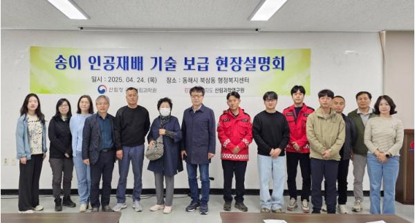 이번 현장 설명회는 산불로 훼손된 송이산 복원을 위해 마련됐다. 설명회에는 2000년 산불 피해지였던 동해시에서 송이를 채취하는 임업인과 관계자들이 참석해, 송이 재배 협조 사항과 시험지 조성 및 활용계획 등 인공 재배에 필요한 다양한 정보를 공유했다.