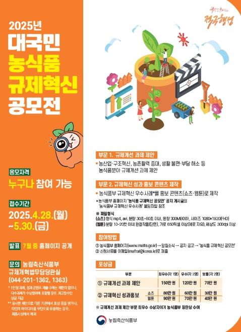 농림축산식품부는 국민의 눈높이에서 현장 체감도가 높은 규제개선 과제를 발굴하기 위해 4월 28일부터 5월 30일까지 5주간 ‘2025년 농식품 규제혁신 공모전’을 개최한다.