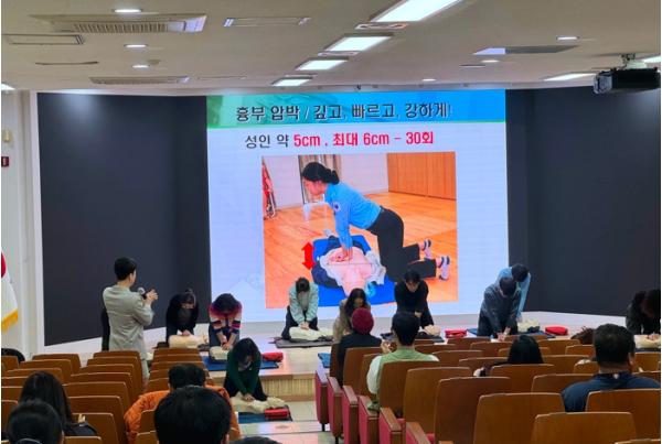 응급처치교육에 참여한 교직원 중 한 명은 “실제 현장에서 생길 수 있는 응급상황과 변수를 가정해 대처법을 익히고, 교대로 심폐소생술을 실시하는 연습 및 제세동기 사용법이 큰 도움이 됐다.”라고 소감을 밝혔다.