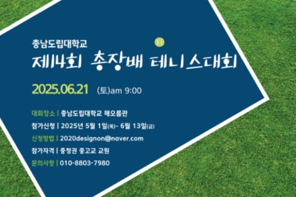 충남도립대학교가 충청권 중‧고등학교 교원들과의 소통과 화합을 도모하고, 대학의 교육 역량과 브랜드 가치를 널리 알리기 위해 ‘2025 총장배 제14회 테니스 및 제3회 배드민턴 대회’를 개최한다.
