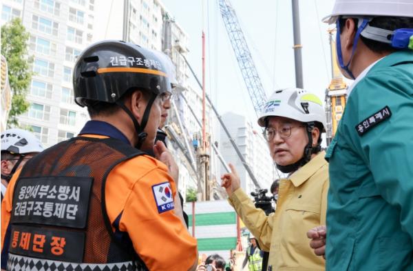 김동연 경기도지사가 지난 5일 밤 천공기(지반을 뚫는 건설기계) 전도사고가 발생한 용인시 기흥구 서천동 인덕원~동탄 복선전철 공사 현장을 찾아 사고 수습 상황을 점검했다.
