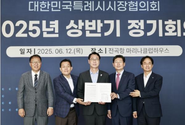화성특례시가 12일 전곡항 마리나클럽하우스에서 열린 ‘대한민국특례시시장협의회 2025년 상반기 정기회의’에서 정명근 화성특례시장이 신임 대표회장으로 선출됐다고 밝혔다. 임기는 2026년 6월 30일까지다.