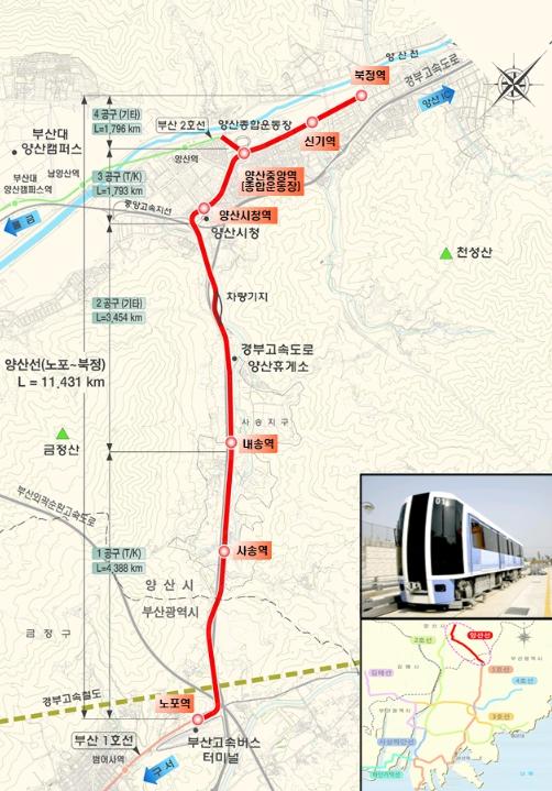 양산 도시철도는 부산 도시철도 1호선 노포역에서부터 양산 사송택지지구를 거쳐 북정동을 잇는 길이 11.43㎞, 정거장 7개, 차량기지 1개소, 총사업비 7,963억 원 건설사업으로, 부산 도시철도 2호선 양산역과도 연결된다.