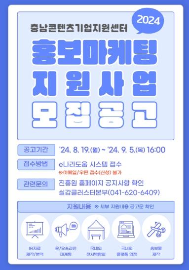 충남정보문화산업진흥원이 운영하는 충남콘텐츠기업지원센터에서 도내 콘텐츠 기업의 국내외 시장진출 및 판로개척 지원을 위한 ‘2024 홍보마케팅 지원사업’을 추진한다고 밝혔다.