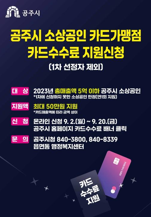 9월부터 2차로 카드수수료 지원 신청을 받을 예정으로 대상은 1차에 신청하지 못한 소상공인 중 2023년 연 매출 5억원 이하인 관내 소상공인이다.