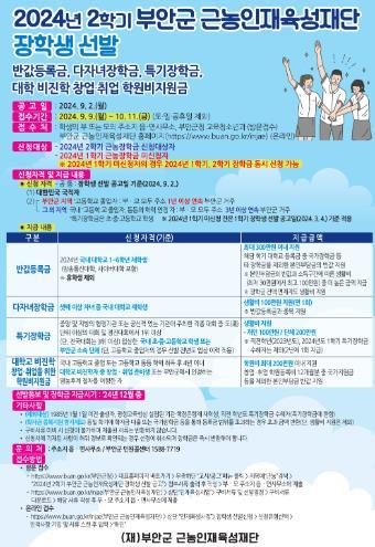 부안군 근농인재육성재단은 2024년 2학기 장학생 신청 접수를 위해 각종 홍보자료를 준비하고 온라인 접수 시스템을 정비하는 등 장학금 지급 준비를 모두 마쳤다고 전했다.