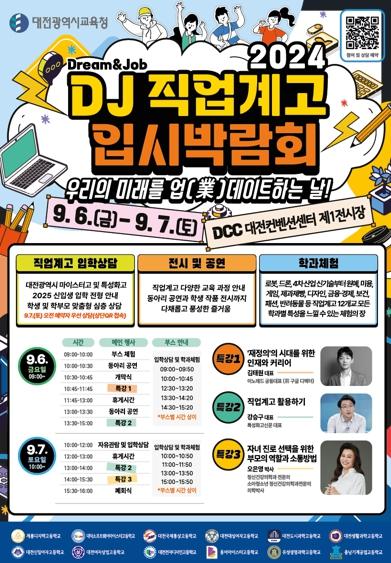 대전광역시교육청은 9월 6일부터 7일, 양일간 오전 9시부터 오후 4시까지 DCC대전컨벤션센터 제1전시장에서 ‘우리의 미래를 업(業)데이트하는 날’이라는 주제로 ‘2024년 DJ(Dream & Job) 직업계고 입시박람회’를 실시한다고 밝혔다.