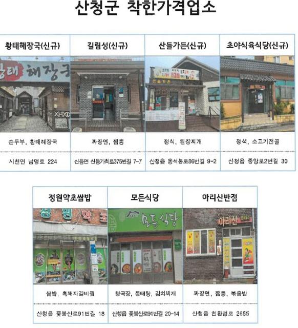 신규지정 업소는 시천면 황태해장국, 신등면 길림성, 산청읍 산들가든, 초야식육식당으로 착한가격업소 인증 표찰을 부여한다.