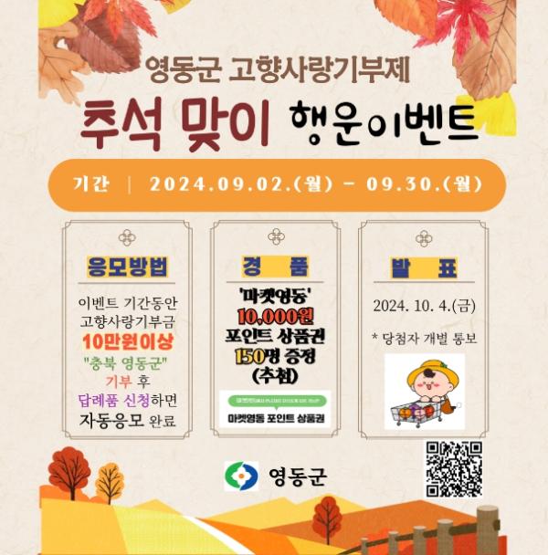 충북 영동군은 추석 명절을 맞아 영동군 고향사랑기부제를 홍보하고자 ‘추석 맞이 행운 이벤트’를 9월 30일까지 진행한다.