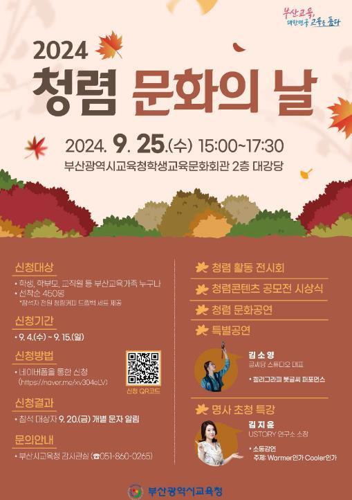 부산광역시교육청은 오는 25일 오후 3시 부산교육문화회관 대강당에서 학생, 학부모, 교직원 등을 대상으로 ‘2024년 청렴 문화의 날’을 개최한다고 3일 밝혔다.