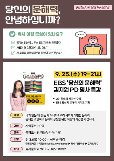 인천광역시교육청중앙도서관은 9월 독서의 달을 기념하여 오는 25일 오후 7시에 명사 특강 ‘당신의 문해력, 안녕하십니까?’를 운영한다.