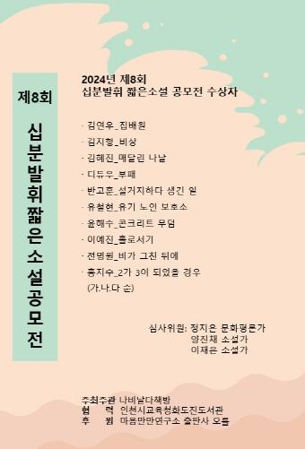 인천광역시교육청화도진도서관은 배다리 지역서점 나비날다책방과 협력하여 운영한 ‘2024년 제8회 십분발휘 짧은 소설 공모전’ 당선작 10편을 3일 발표했다.