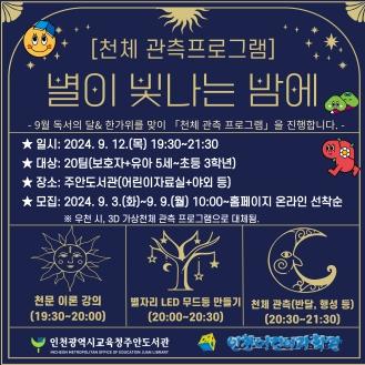 인천광역시교육청주안도서관은 9월 독서의 달과 한가위를 맞아 유아 5세~초등 저학년 학생을 대상으로 ‘별이 빛나는 밤에: 천체 관측 프로그램’을 9월 12일 오후 7시 30분부터 2시간 동안 운영한다.