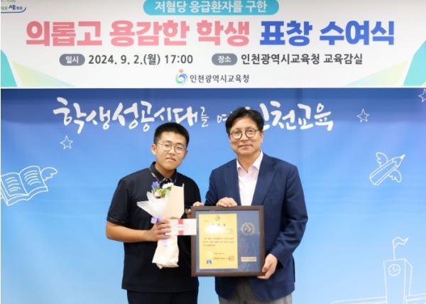 도성훈 교육감은 최근 저혈당 환자를 구한 인천성리중학교 3학년 송민재 학생에게 2일 교육감 표창을 수여하고 격려했다. 이 자리에는 인천유나이티드 전달수 대표와 관계자, 송민재 학생 학부모, 인천성리중학교 교사가 함께 참석했다.