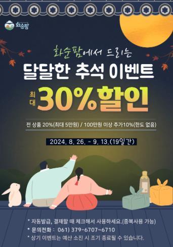 현재 화순팜에서는 9월 13일까지'추석맞이 달달(月)한' 이벤트를 진행하고 있으며, 전 상품 20% 할인 쿠폰(최대 5만 원)과 100만 원 이상 구매 시 추가 10% 할인 쿠폰을 지급하고, 신규회원에게는 2,000원 할인 쿠폰을 추가로 지급한다.
