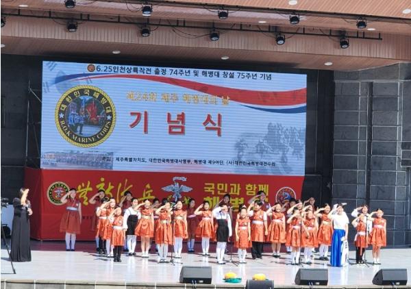 제주도교육청 신제주초등학교 ‘신제주 지꺼진 코풀레기 합창단’은 1일 탑동해변공연장에서 열린 제24회 제주 해병대의 날 축하 공연에 참여하여 안무 동작과 함께 돌이영 낭이영 & 느영나영 노래를 불러 관객들에게 즐거움을 선사했다.