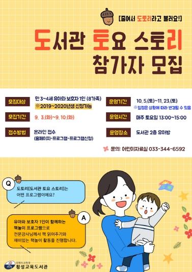 횡성교육도서관은 10월 5일부터 11월 23일까지 8회에 걸쳐 유아 책놀이 프로그램인 도토리(도서관 토요 스토리)를 운영한다.