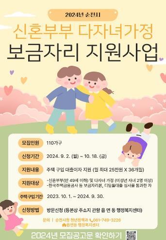 순천시는 무주택 신혼부부 및 다자녀가정의 주거비 부담을 완화하고 안정적인 주거 지원을 위한 ‘2024년 신혼부부·다자녀가정 보금자리 지원 사업’대상자를 10월 18일까지 모집한다고 밝혔다.
