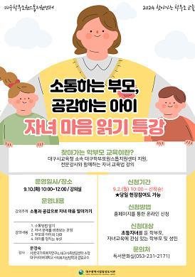 이번 특강은 대구학부모원스톱지원센터 주관 2024 찾아가는 학부모교육 ‘손안의 학부모교실’프로그램의 일환으로, 학부모들과 자녀의 원활한 소통·공감 및 자녀의 심리에 대한 이해를 돕기 위해 ‘소통과 공감으로 자녀 마음 알아가기’라는 주제로 진행된다.
