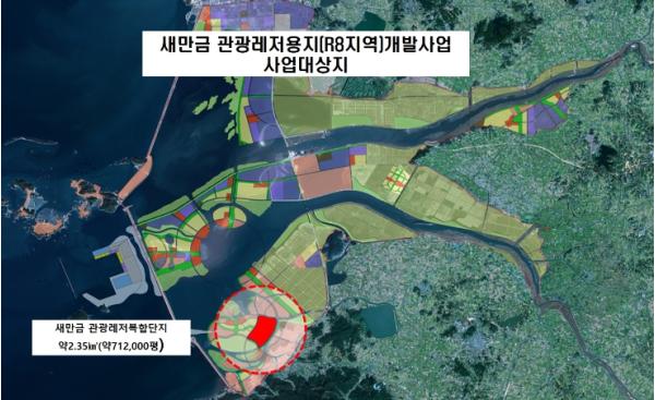 새만금개발청은 2,500억 원 이상을 직접 투자하여 관광레저용지 공유수면 2.35㎢(새만금기본계획 상 R8지역) 내에 관광레저복합단지를 개발할 사업자를 9월 3일 공모했다고 밝혔다.