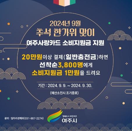 여주시는 추석 한가위를 맞이하여 지역화폐 ‘여주사랑카드’ 소비지원금을 오는 9월 9일부터 지원한다고 밝혔다.