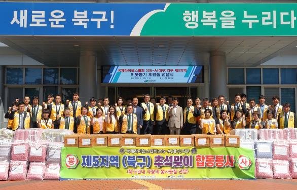 국제라이온스협회 356-A(대구)지구 제5지역에서는 9월 4일 추석을 맞아 저소득 취약계층을 위해 1,000만원 상당의 라면 150박스, 이불패드 150채를 대구 북구청에 기탁했다.