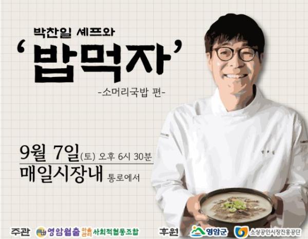 영암군이 7일 오후 6시 30분부터 영암읍 매일시장 거리에서 대표 먹거리 개발 요리 콘서트 ‘박찬일 셰프와 밥먹자’를 개최한다.