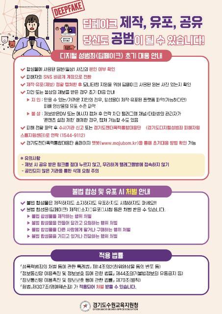 경기도수원교육지원청은 최근 불법으로 사진을 합성하는 ‘딥페이크’성범죄물이 사이버 공간의 단체 대화방에서 공유되어 가정과 학교 현장의 불안감이 커지는 상황에 대응하기 위해 ‘디지털 성범죄(불법 합성 및 유포)’대응 및 예방 교육을 위한 카드 뉴스 및 초?중등 3차시 교육자료를 제작하여 각급 학교에 보급하기로 하였다.