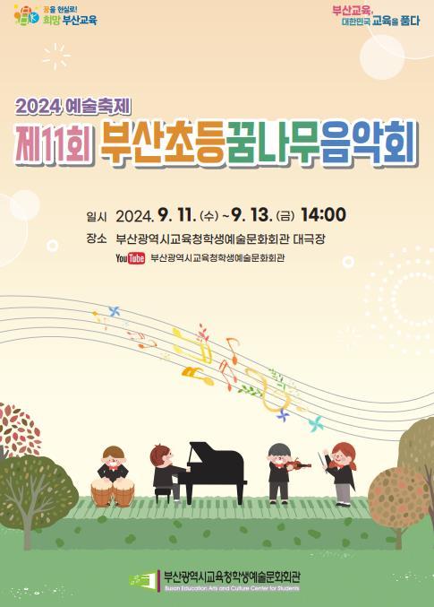부산광역시교육청학생예술문화회관은 오는 13일까지 회관 대극장에서 ‘2024 초등꿈나무음악회’를 개최한다고 11일 밝혔다.