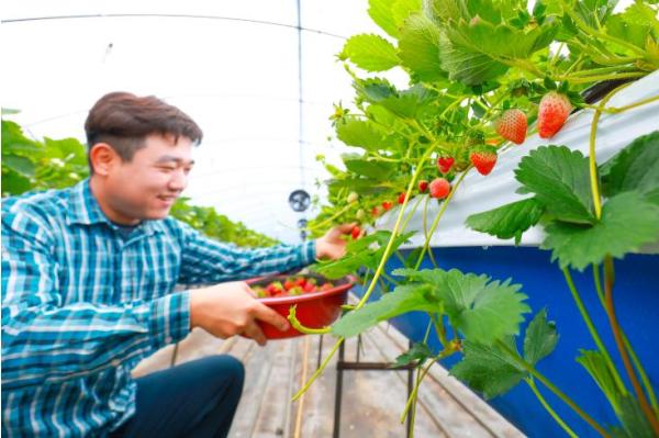 23일 오전 산청군 신등면 단계리 최종식씨 딸기 농가에서 올해 첫 딸기를 수확하고 있다.