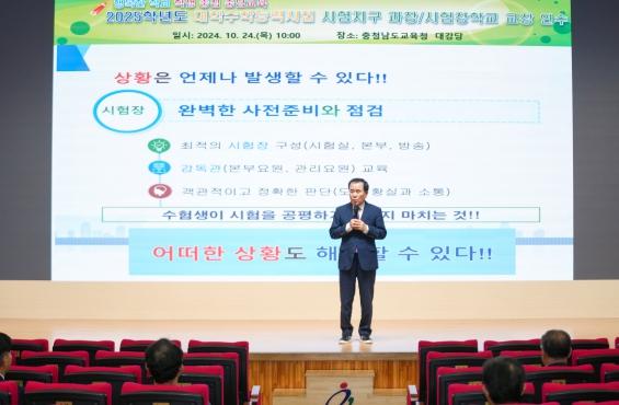 충남교육청은 10월 24일 충청남도교육청 강당에서 2025학년도 대학수학능력시험 수험생 유의사항 교육을 담당하는 교사와 시험지구 담당자를 대상으로 연수를 실시했다.