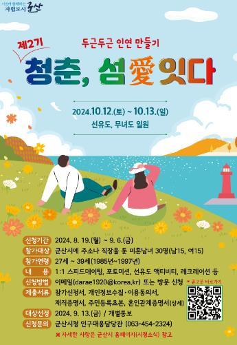 군산시는 8월 19일부터 9월 6일까지 제2기 두근두근 인연만들기 ?청춘, 섬愛잇다? 참가자를 모집한다.